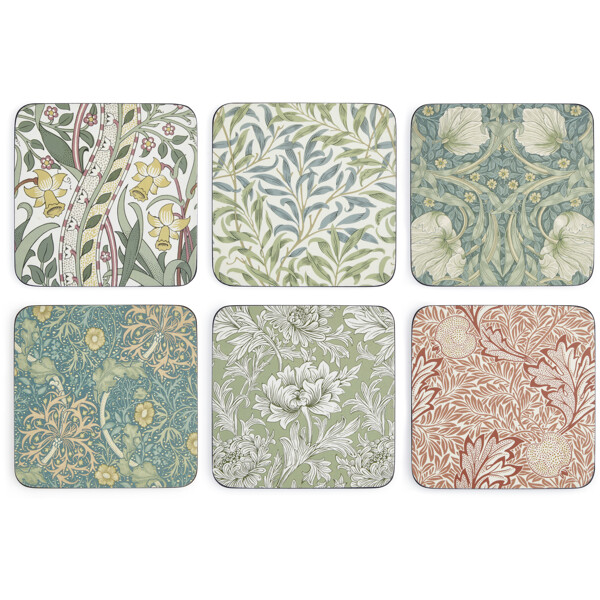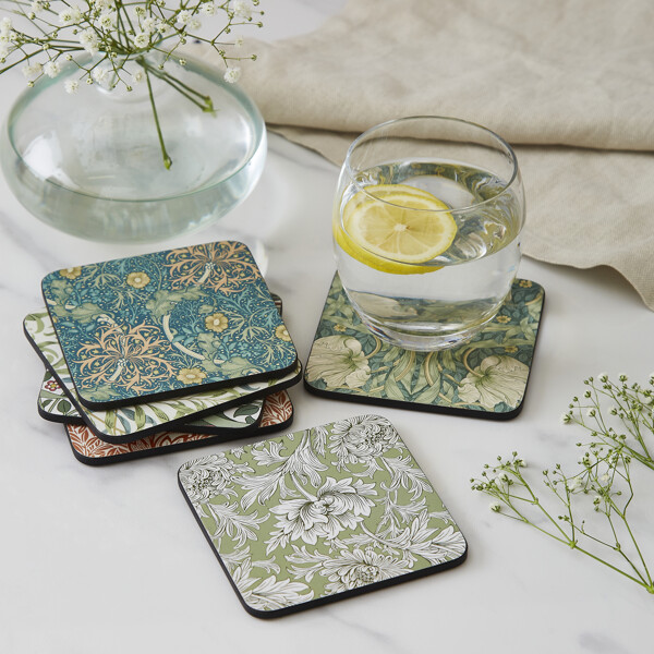 Dessa glasunderlägg från William Morris & Co kombinerar praktikalitet med tidlös skönhet, med olika mönster i varje set. Glasunderläggen har en korkbotten och är värmeresistenta, vilket skyddar dina ytor på ett stilfullt sätt. Underläggen enkla att rengöra med en fuktig trasa. En elegant och funktionell tillgång till varje hem.