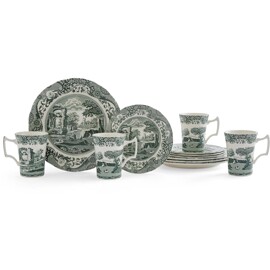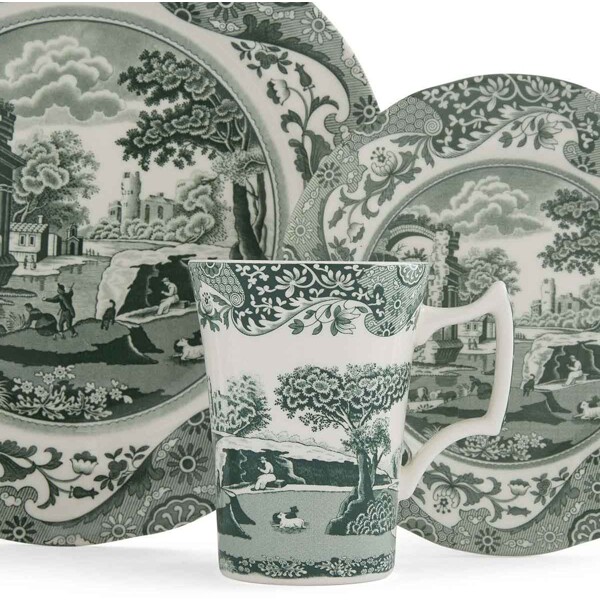 Heritage Green Italian 12-delars set är en vacker introduktion till en av Spodes mest älskade servismodeller – nu i en djupgrön tolkning av det klassiska Blue Italian-mönstret. Setet innehåller fyra middagstallrikar, fyra mindre tallrikar och fyra muggar – allt i Spodes högkvalitativa porslin med välkända former och dekor.Motiven är inspirerade av den pittoreska italienska landsbygden, inramade av det eleganta 1700-tals Imari Oriental-mönstret som löper längs kanterna. Setet passar lika bra för vardagsmåltider som för finare dukningar, och är ett utmärkt val för den som vill börja samla på denna ikoniska serie.Tillverkat i Stoke-on-Trent, England – navet för brittisk porslinstradition sedan 1700-talet.Innehåll & mått:4 × Tallrik Ø27 cm – höjd 2 cm 4 × Tallrik Ø20 cm – höjd 2 cm 4 × Mugg 0,28 L