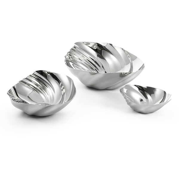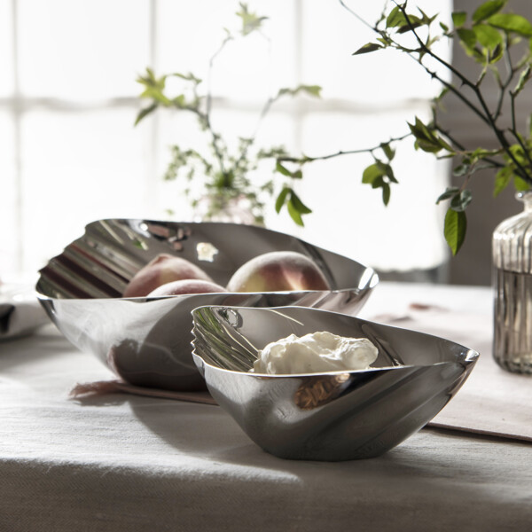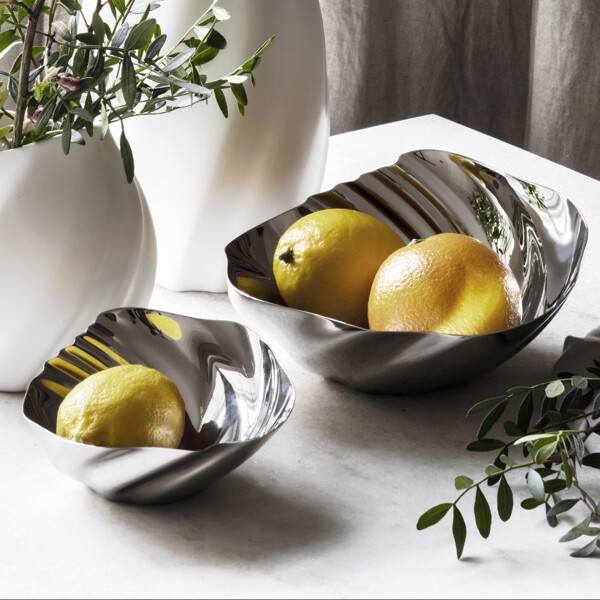 Robert Welch Cascade-skålar är inspirerade av naturens rörelse. Den organiska formen för tankarna till vattenfallens vågmönster, vindens skulpterade sanddyner eller stora musselskal. Den spegelpolerade ytan framhäver skålarnas skulpturala karaktär och låter dem fånga och reflektera ljus och färger på ett unikt sätt.