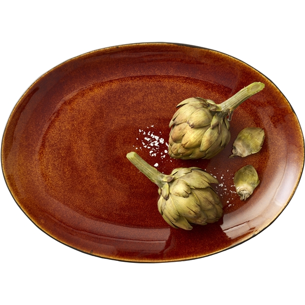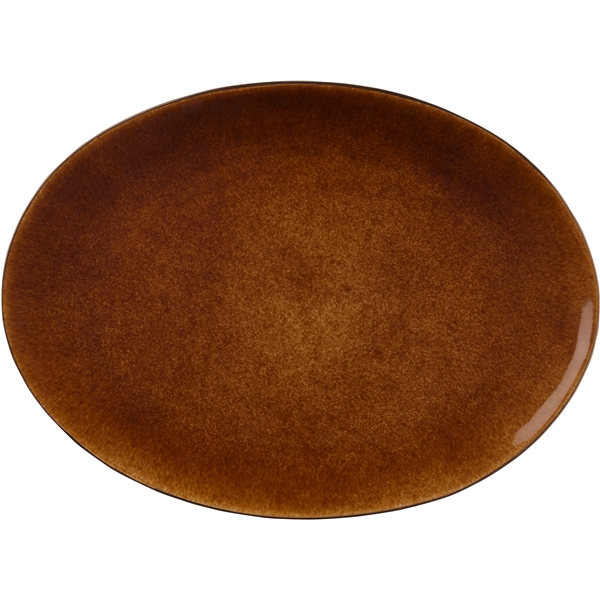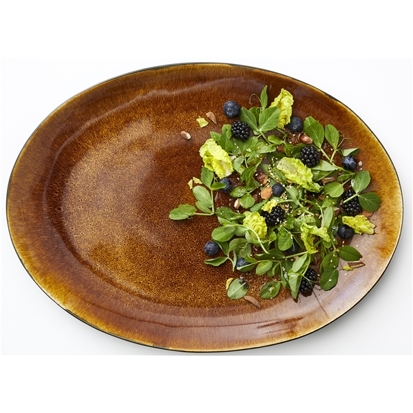 Fat ovalt 45x34cm stort ovalt fat i svart stengods med matt reaktiv glasyr på utsidan kombinerat med en fin blank glasyr på insidan. Fatet är imponerande vackert till sallader och anrättningar. Lämpligt till maskindisk. På grund av tillverkningsprocessen förekommer både färgskillnader och variationer i glasyren, vilket ger varje exemplar ett helt unikt utseende.