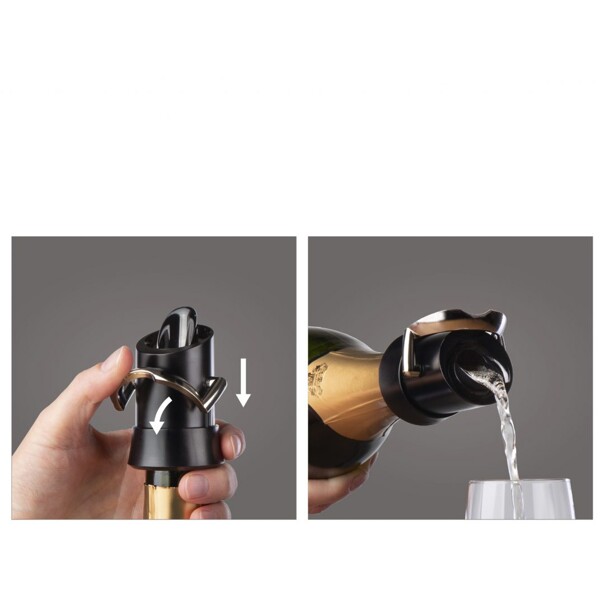 Champagne-förslutare hjälper dig att behålla champagnebubblorna och minimera oxidationen i en öppnad flaska. När den är fastlåst i flaskan, kan du öppna med spaken och servera droppfritt och stänga igen för att hålla champagnen fräsch.