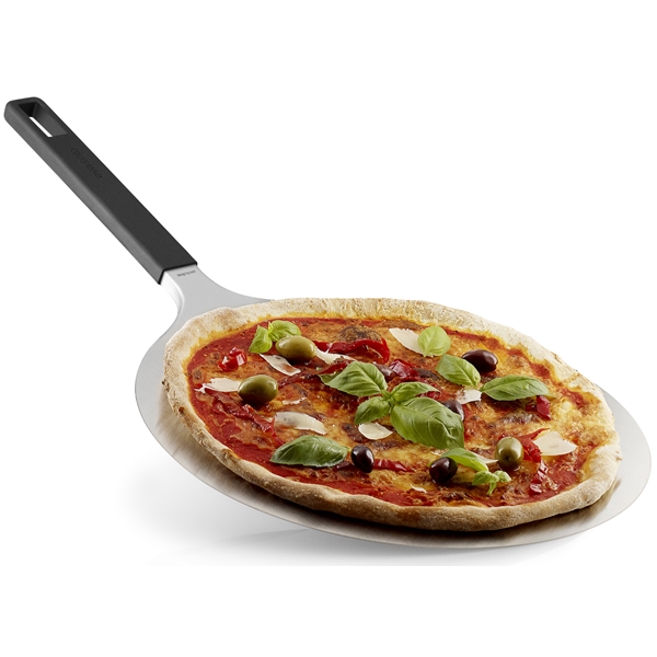 Design: Eva SoloDenna praktiska pizzaspade är till stor hjälp när man ska tillaga pizza och tar knappt någon plats när det inte används.Pizzaspaden har silikonhandtag som förblir kallt under användning. Dessutom finns det hål i handtagen så att de går att hänga upp, t.ex. på sidan av grillen.