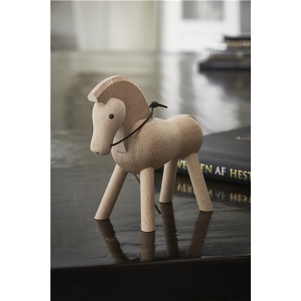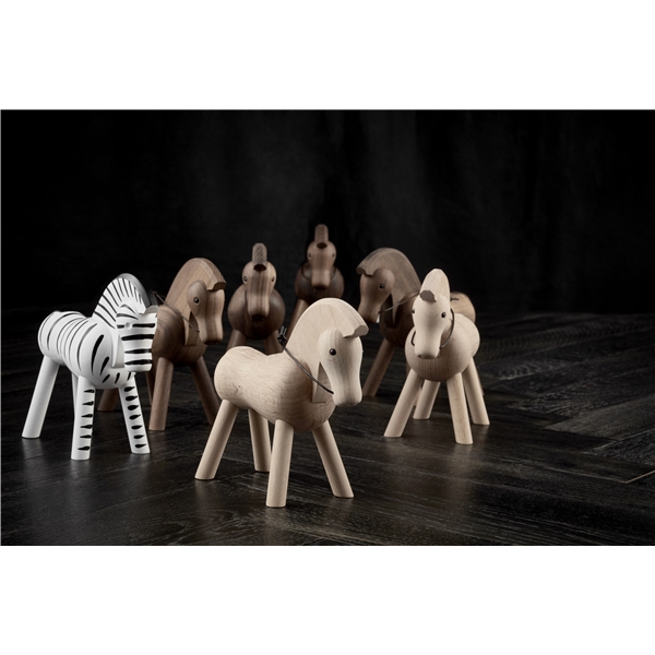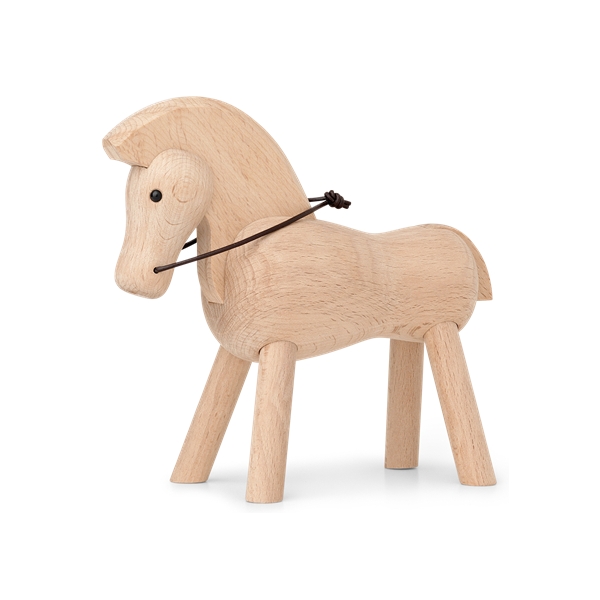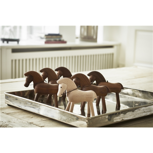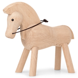 En presentidé för livet. Denna Kay Bojesen-häst såg dagens ljus första gången i början av 1930-talet. Med stolt hållning, kraftig man och tyglarna redo inbjuder denna häst till fantasiturer i munter galopp. De mjuka formerna och styva benen ger hästen det typiska uttryck som Kay Bojesens trädjursfamilj är känt för: Muntra linjer utan tanke på att återge verklighetens djur, utan däremot fantasifulla varianter som snabbt hittar sin plats i alla hem. En bra presentidé till konfirmanden, studenten, till bröllop och alla andra minnesvärda tillfällen.Storlek: höjd: 14 cm.Design: Kay Bojesen. Material: Valnötsträ och bok.