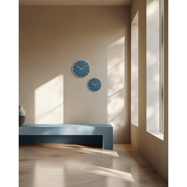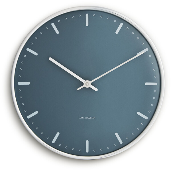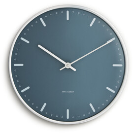 Funktionalism. Enkelhet. Arne Jacobsen. City Hall-vägguret från Arne Jacobsen Clocks är design i sin renaste form – skapat för att visa tiden, och inget annat. Arne Jacobsen ansåg att en klocka skulle fylla en enkel funktion utan onödiga störande moment. Med denna exklusiva utgåva av hans klassiska City Hall-väggur – nu i nya, moderna färger från Arne Jacobsens egen färgpalett på både urtavla och boett – får City Hall ett helt nytt, men ändå minimalistiskt uttryck, troget sitt ursprung och Arne Jacobsens designvision. City Hall-uret skapades ursprungligen för Rødovre Rådhus, där det ingick i arkitektens helhetskoncept för det nya rådhuset som färdigställdes 1956. Designen är tidlös, klassisk och helt enkel – men samtidigt karaktäristisk. Med sitt svävande uttryck på väggen hänger City Hall-vägguret nästan som en skulptur i hemmet, som en elegant representant för det bästa inom dansk design. Detta City Hall-väggur levereras med blå urtavla, medan boett, visare och timmarkeringar är i en blank silverfinish som utstrålar exklusivitet. Använd det i klassisk inredning som ett funktionellt designelement med stark visuell närvaro. Och även om uret har fått en färguppdatering är det ändå Arne Jacobsens unika formspråk som tydligt framträder – och skapar en spännande kontrast mellan de klassiska formerna och den nytänkande färgsättningen från Jacobsens stora designarkiv. Element som ger uret massor av karaktär – ett diskret statement som aldrig stör rummet. Ändå får du med en klocka från Arne Jacobsen Clocks en designikon som kan lyfta eller fullända vilket rum som helst. Arne Jacobsen trodde på att reducera, inte lägga till. På att låta formen följa funktionen. Ett princip som inte bara lever i designen, utan även i hur vi väljer att använda vår tid. Som en av 1900-talets mest inflytelserika danska arkitekter och formgivare satte Arne Jacobsen sin modernistiska prägel på arkitektur och design i över 50 år – inte bara i Danmark, utan även internationellt. Hans kompromisslösa syn på design och formgivning har resulterat i den ena designklassikern efter den andra, som återfinns både på museer och i otaliga privata hem, där de är en naturlig del av vardagen. Som arkitekt och förebild tillägnade han sin karriär åt att hitta in till kärnan och tänka nytt kring produkter och strukturer ur ett funktionellt, minimalistiskt perspektiv. Ett synsätt som självklart också präglar Arne Jacobsen Clocks design idag. Tiden går. Design består. Naturligtvis ska en klocka visa tiden. Men varför inte använda din klocka från Arne Jacobsen Clocks för att skapa medvetna pauser – i din egen tid? Använd den som en påminnelse om att sakta ner tempot och fokusera på det som verkligen betyder något. Din tid. Utan avbrott. För med det ikoniska City Hall-vägguret från Arne Jacobsen Clocks är tiden också tidlös – en universell klockdesign, kompromisslös och elegant. Forever keeping up with time.