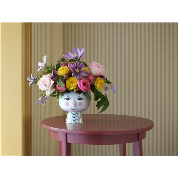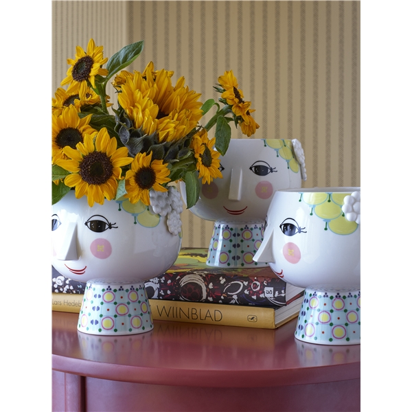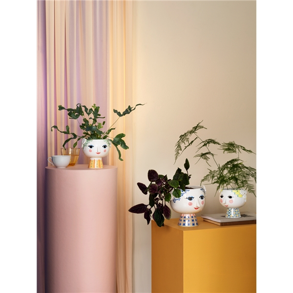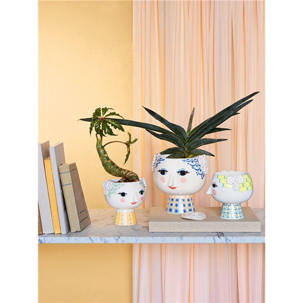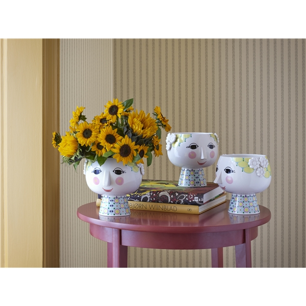 Eva ytterkruka är en omtolkning av Bjørn Wiinblads välkända ytterkrukor och med vacker dekoration. Krukan ger ditt hem en touch av retro-coolness med den fina halsen och det vackra kvinnoansiktet. Använd Eva-krukan på fot till allt från kryddor till ljung, vita julrosor och trendiga kaktusar för att förstärka 70-talsnostalgin. Kan inte diskas i maskin.