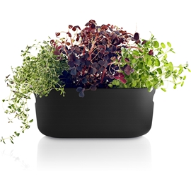 Självbevattningskruka från Eva Solo. Ha en egen örtträdgård i köket och låt den sköta sig själv. Herb organiser har ett självvattnande system vilket ser till att örterna inte behöver vattnas på flera dagar. Den ger örterna de bästa förutsättningarna för att växa, eftersom de står i en självvattnande blomlåda som transporterar vattnet från reservoaren i botten av keramikkrukan till växterna. Vattenreservoaren rymmer upp till 0,5 liter vatten, så att allt som behövs är att regelbundet fylla på vatten, resten klarar systemet själv. Herb organiser har praktiska handtag i var ände och är därför lätt att flytta på. Den rymmer upp till tre normalstora örtväxter i egna plastkrukor. Alla delar utom blomlådan tål maskindisk.