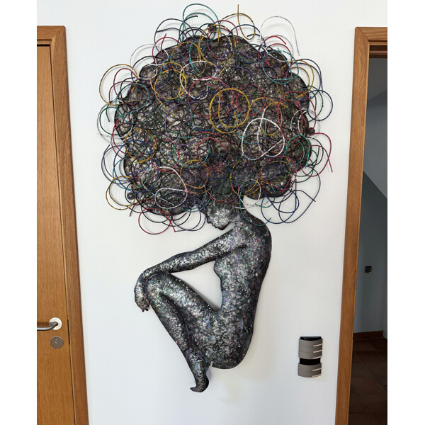 Storlek: Cirka 125 x 70 x 25 cm Material: 100% metall, skickligt formad och utformad. Handgjord Perfektion: Varje skulptur är helt handgjord, vilket återspeglar konstnärlighet och unik karaktär. Unik Design: Har en djärv, abstrakt feminin figur med komplext sammanflätade metall öglor, vilket skapar en multidimensionell effekt.