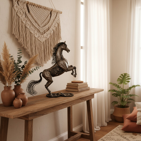 Höj din inredning med denna fantastiska, 100% handgjorda häst skulptur, ett verkligt bevis på konstnärlig skicklighet och hållbar design. Varje detalj av detta magnifika verk är noggrant tillverkad av återvunnet metall, vilket ger nytt liv åt kasserade material och förvandlar dem till ett unikt konstverk. Denna slående skulptur fångar en hästs dynamiska elegans och blir en kraftfull mittpunkt i vilket rum som helst. Metallens råa skönhet, kombinerad med den detaljerade konstnärligheten, garanterar att inga verk är exakt likadana. Ta hem ett verk som berättar en historia om kreativitet, skicklighet och miljömedvetenhet. En perfekt samtals startare och en unik present för konstälskare! Mått: Cirka 15 x 35 x 45 cm Miljövänlig 100% Handgjord Återvunnen Metall