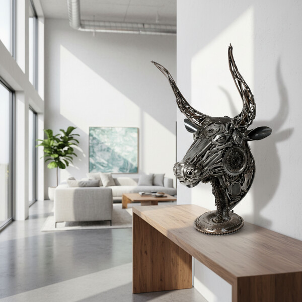 Släpp lös en kraftfull konstnärlighet i ditt hem med vår imponerande tjurhuvud skulptur! Detta extraordinära verk är ett sant resultat på rå styrka och hållbar design, och är 100 % handgjort av skickliga hantverkare från återvunnet metall. Varje detalj från dess imponerande horn till dess beslutsamma blick, berättar en unik historia om förvandling, som förvandlar överblivna komponenter till ett häpnadsväckande konstverk. Denna unika metall skulptur är perfekt anpassad för att göra ett starkt intryck. Idealisk som en fängslande fokus punkt i ett vardagsrum, kontor eller en industriell miljö, dess robusta närvaro och konstruktion (som visar upp kugghjul, kedjor och olika metall fragment) blandar rå industriell estetik med naturens ursprungliga kraft. Det är mer än bara dekoration; det är en djärv och en kraftfull symbol för uppfinningsrikedom och miljömedvetenhet. Mått: Ungefär 70 x 55 x 70 cm Miljövänlig 100 % Handgjord Återvunnen Metall