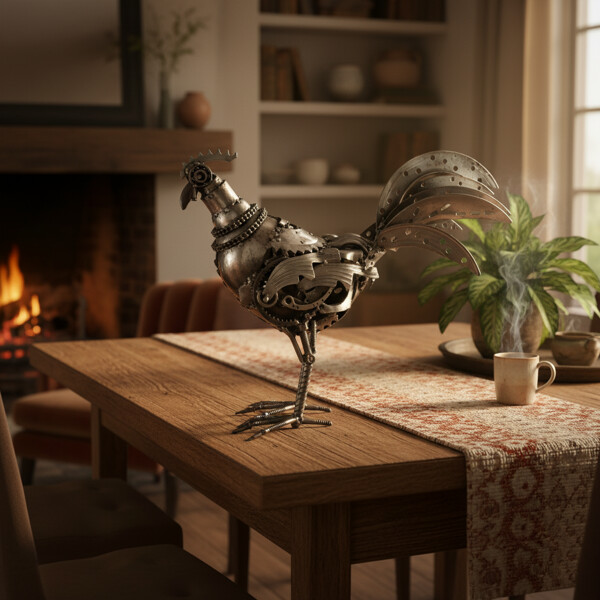 Våra skickliga hantverkare har förvandlat återvunna material och på ett smart sätt integrerat kugghjul, kedjor och olika metalldelar för att skapa en magnifik och detaljerad representation av en stolt tupp. Varje fjäder i dess imponerande svans, dess starka hållning och dess ståtliga kam är noggrant integrerade, vilket skapar en verkligt unik skulptur som kombinerar industriell estetik med livfull bondgårds charm.