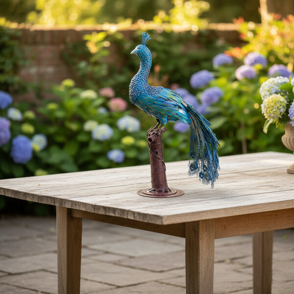 Förnya ditt hem med vår handgjorda påfågelmetallskulptur, ett fantastiskt 100% handgjort verk tillverkat av återvunnen metall. Den eleganta skulpturen, med lager och livfulla blå och gröna nyanser, tillför exotisk charm och konstnärlig stil till vilken inredning som helst.Mått: Ungefär 30 x 40 x 90 cm Miljövänlig 100% Handgjord Återvunnen Metall