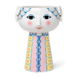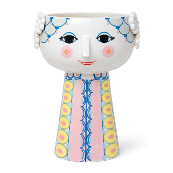 Vacker vas i rosa nyans med en leende Eva på från Björn Wiinblad. Den höga vasen är perfekt för en vacker blombukett i. Vasen i blank glaserad keramik med färgad dekor från Eva-serien har ett brett huvud med blomdekorationer och konformad kropp. Matcha tillsammans med de andra delarna från Björn Wiinblads keramikserie med kvinnoformer och färgglatt mönster.