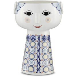 Fin Eva vas från Bjørn Wiinblad i en härlig blå nyans. Vasen är 18,5 cm hög och har en diameter på 11 cm, vilket gör det perfekt för vackra blombuketter eller för en enda stor blomma. Vasen är gjord i blankglaserat porslin med färgad dekor och är inspirerad av Bjørn Wiinblads ursprungliga EVA-vaser, som hade breda huvuden och en konformad kropp. Det utsökta ansiktet har Bjørn Wiinblad ritat själv och klänningsmönstret kommer från hans illustrationer.