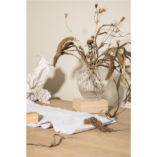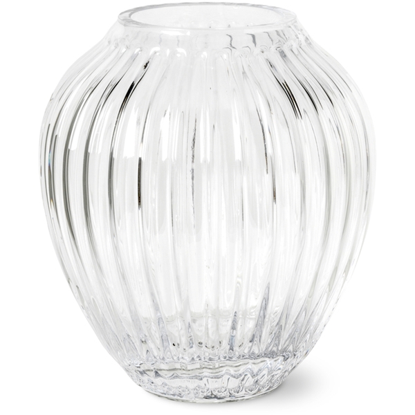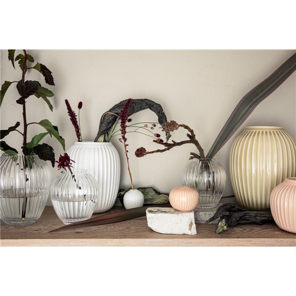 Hammershøi glasvas från Kähler, 15 cm hög. Vasen har de karaktäristiska räfflorna som kännetecknar Hammershøi-serien och formen är inspirerad av de välkända vaserna från serien. Den munblåsta vasen har en egen vacker siluett som har ett enkelt och tidlöst uttryck som klär flera olika typer av blommor. Den stabila vasen är designad av Hans-Christian Bauer. Vasen finns i flera storlekar.