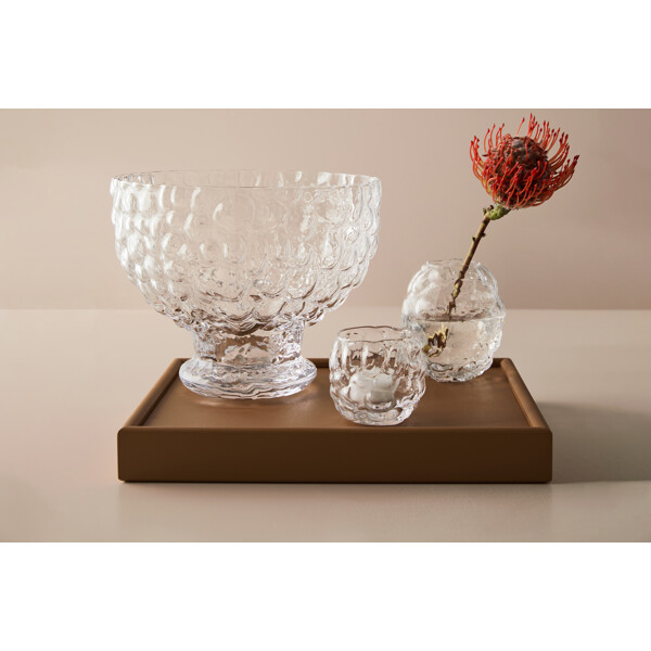 Serien Moss från Kosta Boda är skapad ur återanvända gamla formar från Kosta Glasbruk som karvats ur för hand för att få fram en unik, böljande och levande yta i glaset. Minivasen tillverkas nu i klarglas och ger en dimension av liv där blommor kan bubbla upp ur vasen . Tillverkad i Kosta med design av Åsa Jungnelius och togs initialt fram i ett samarbete med Göteborgs Operas 30års jubileum.
