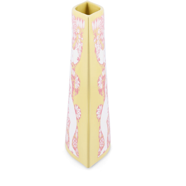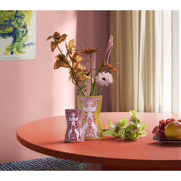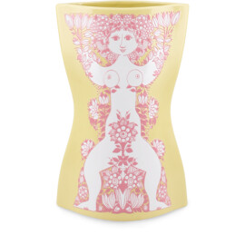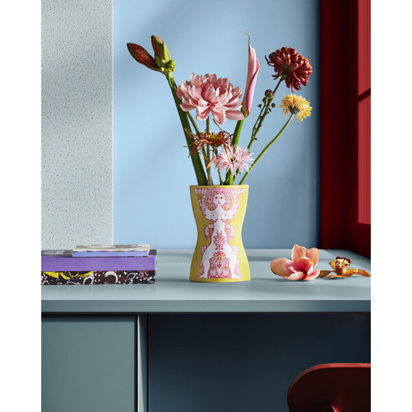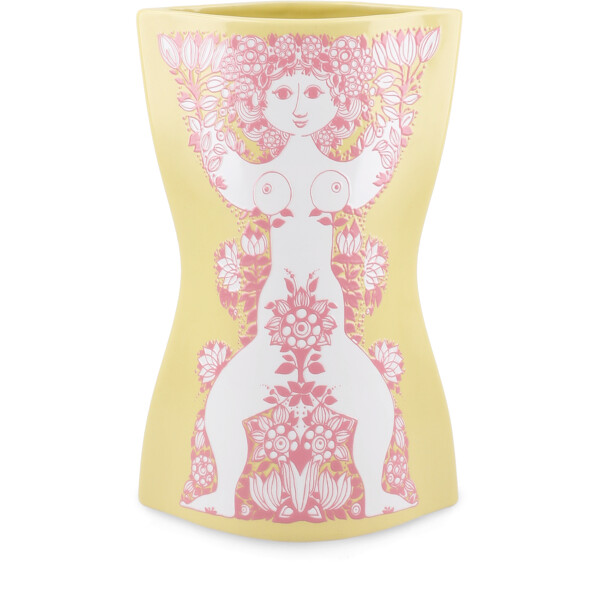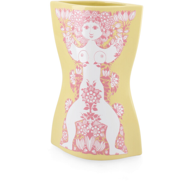 Ett färgstarkt konststatement till ditt hem. Med Nina-serien från Bjørn Wiinblad får du en djärv och konstnärlig tolkning av kvinnokroppen i keramik som hyllar former, frihet och glädje med ikoniska linjer och en levande färgpalett. Ett visuellt kraftfält baserat på originalkonstverk som lyfter rummet – och humöret. Nina är ingen klassisk vas. Det är konst i brukbar form, skapad med inspiration från Bjørn Wiinblads imponerande designarkiv, där en kvinnogestalt tolkas med stark grafisk identitet och skulptural silhuett – dekorerad med färgstark, blomstrande botanik i upphöjda dekaler som både kan ses och kännas. Det här är Bjørn Wiinblad när han är som modigast och mest poetisk. De böljande formerna och sensuella detaljerna står som ett kreativt svar på minimalismen – med ett uttryck som sprudlar av liv, lekfullhet, styrka och stolthet. Nina är en hyllning till kvinnokroppen. En hyllning till individualitet. Och en kärleksfull uppmaning att vara sig själv – utan filter, utan kompromisser. Nina-vasen med en höjd på 22 cm präglas av en fräsch gul ton i kombination med kvinnogestalten omsluten av en överdådighet av dekorativa rosa detaljer. En färgstark uppenbarelse av poesi, personlighet och power, som vackert samspelar med Ninas unika karaktär – den böljande formen – som både lyfter fram kvinnomotivet och skapar visuell balans. Nina hyllar former, frihet och glädje – med en somrig och optimistisk färgpalett, en lekfull form och ett imponerande grafiskt uttryck, särskilt kännetecknat av det centrala kvinnomotivet, vars blomkrona och vingar nästan smälter samman i en symmetrisk komposition som är både sensuell och kraftfull. Allt är överfört som färgad dekal på blankglaserad keramik med upphöjt mönster, vilket ger en unik taktil upplevelse. Oavsett vilken Nina-vas du väljer kommer den att ge ditt hem en unik blickfångare och konstnärlig finess, som både kan rymma den vackraste buketten eller stå ensam – helt naken. Och utstråla den djupaste kärlek till allt det som gör oss till dem vi är. Bjørn Wiinblad var en livsglad konstnär med en stor och färgstark personlighet, som inte var rädd för att tänka stort, vara annorlunda – och hylla skönheten i det som sticker ut. Den själen lever fullt ut vidare i Nina, som med sin drömska utstrålning och färgstarka styrka bjuder in oss att göra plats för glädje – och att vara oss själva.
