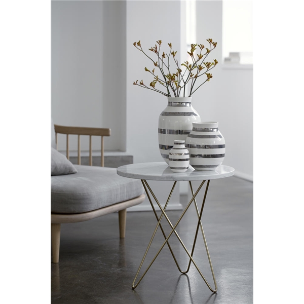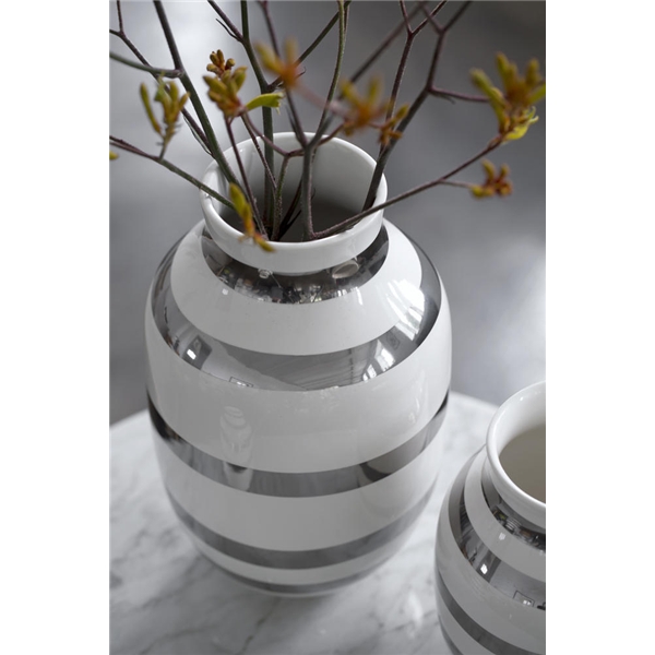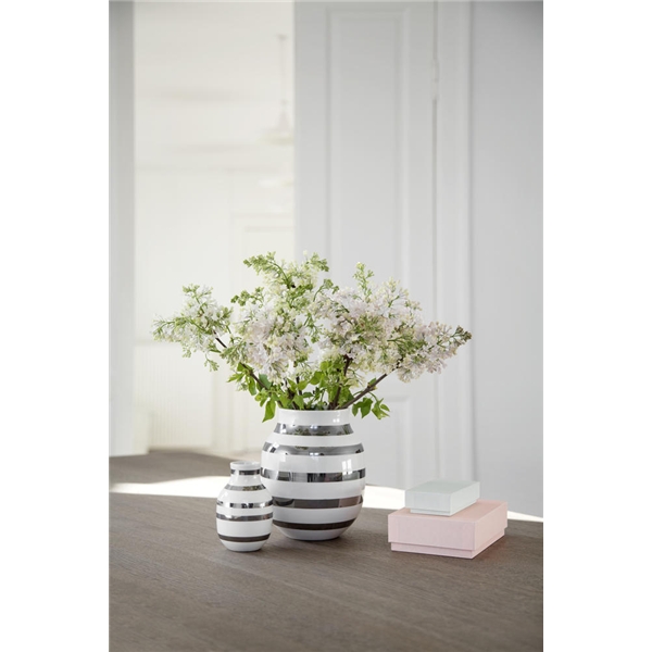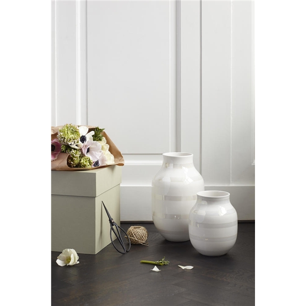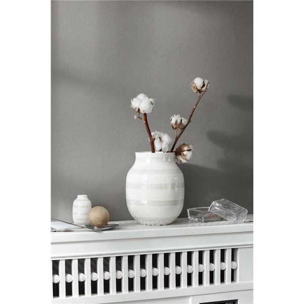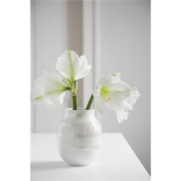 Omaggio-vasen från Kähler är en ikonisk vas som redan har hittat sin väg till många designentusiasters hem runtom i världen. De handmålade ränderna som pryder den klassiska Omaggio-vasen gör varje vas unik. Den mjuka formen kompletterar vasens enkla och grafiska uttryck och lägger till en dynamik vart den än placeras. Fyll den vackra vasen med säsongens färska blommor.