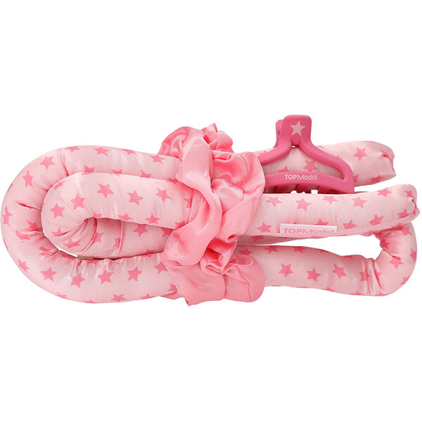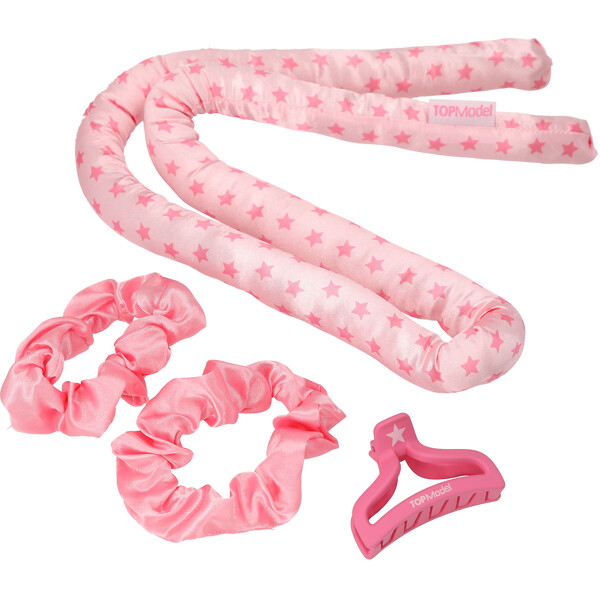 Trolla fram vackra lockar i ditt hår utan värme: detta coola set från TOPModel består av en stor rosa textilrulle med små härtan, 1 rosa hårklämma med hjärtmotiv och två rosa scrunchies.
