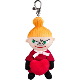 En väskdekoration eller mjukis-nyckelring från Mumin, med Lilla My som håller en liten hjärtkudde i famnen.