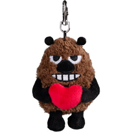 En väskdekoration eller mjukis-nyckelring från Mumin, med Stinky som håller en liten hjärtkudde i famnen.