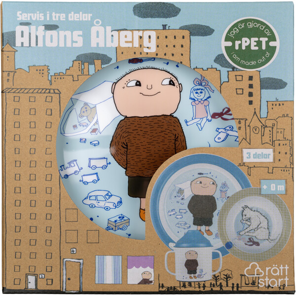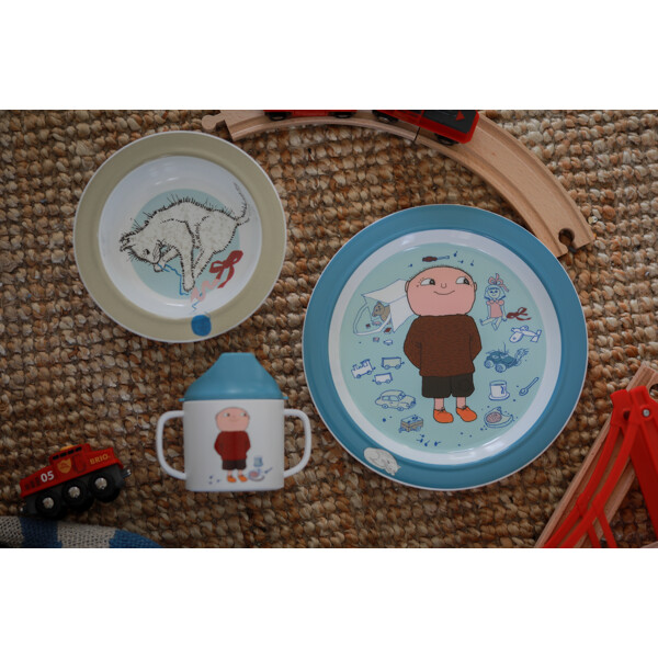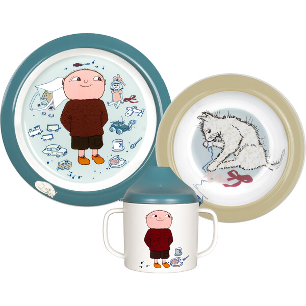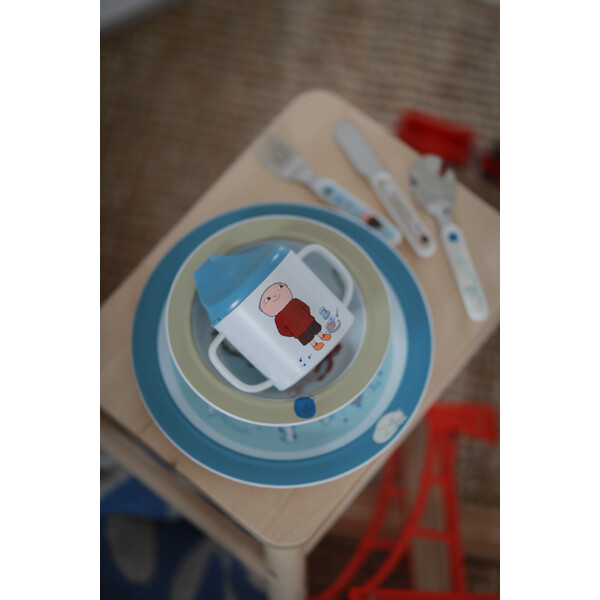 Innehåller en pipmugg med två handtag där locket sitter ordentligt med hjälp utav en silikonring. I pipen finns ett spillstopp som begränsar flödet. När barnet blir äldre kan ventilen plockas bort. Setet har också en djup och en flat tallrik med silikonring undertill som gör att de står stadiga på bordet.