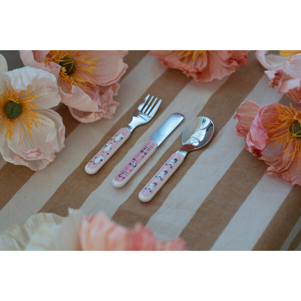 Kniv, gaffel och sked som passar små händer och munnar. Levereras i en fin och praktisk presentkartong.