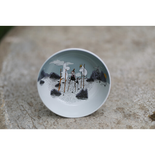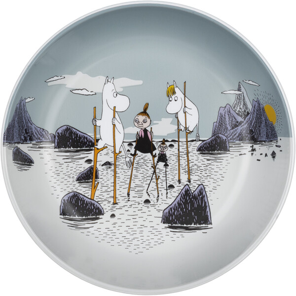 Djup skål med motiv från Mumin, tillverkad i RPET vilket är ett miljövänligt och tåligt material.