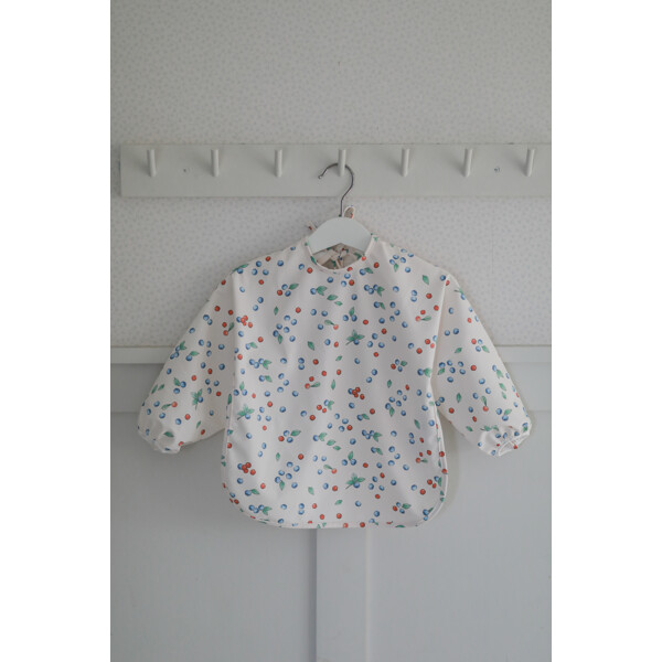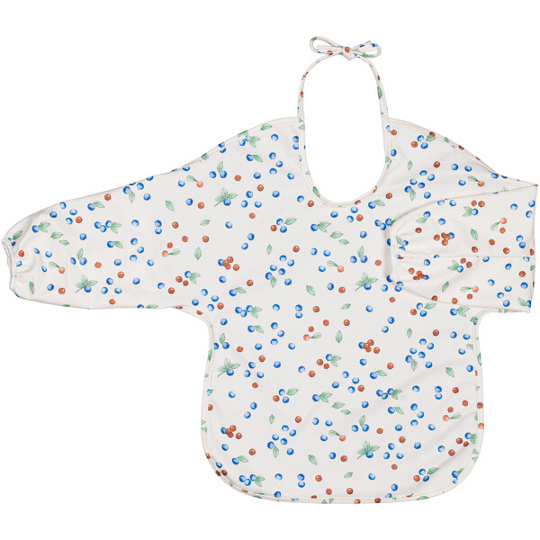 Praktisk haklapp med ärm som kan användas både vid mat och lek med illustrationer från Elsa Beskow bok Puttes äventyr i Blåbärsskogen. Knyts enkelt med snören i nacken.