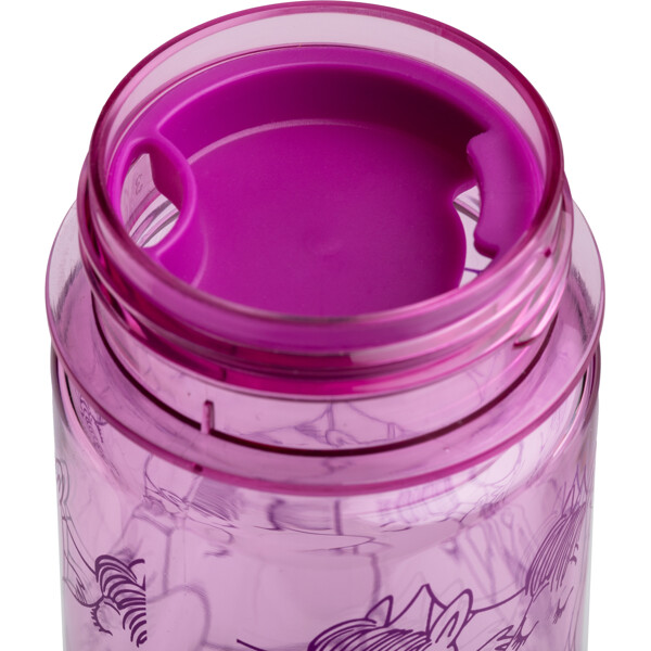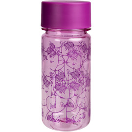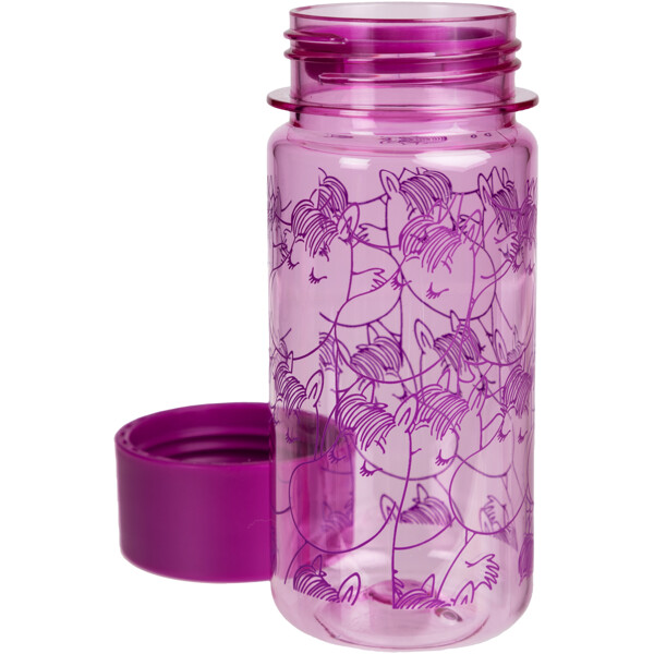 En praktisk 3 dl vattenflaska med fint Snorkfröken-tryck. Den lila flaskan är genomskinlig och tillverkad i BPA-fri tritanplast. Under skruvkorken har den ett löstagbart mellanstycke som gör det lättare att dricka mindre klunkar även för yngre barn.
