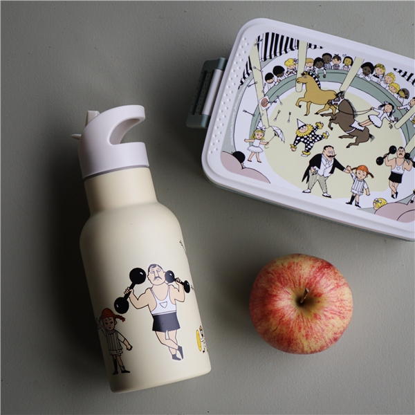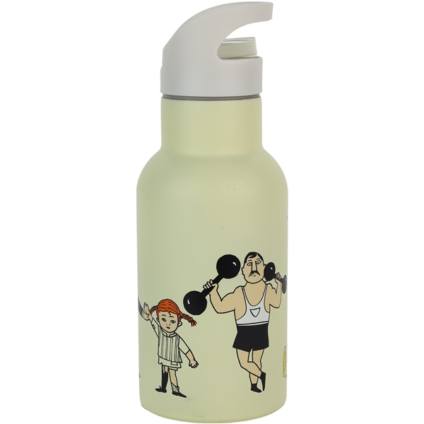 Flaska i högkvalitativt stål med Pippi Långstrump! Flaskan har en termofunktion som gör att vätskor kan hålla sig både varma och kalla ett litet tag. Inuti flaskan finns ett avtagbart sugrör i plast som gör att det kommer lagom mängd när man dricker. Flaskan är enkel att öppna och stänga.Säkerhet: Pipen på flaskan är inte till för att gnaga eller bita på. Flaskan kan användas till små barn men då under full uppsikt av en vuxen.