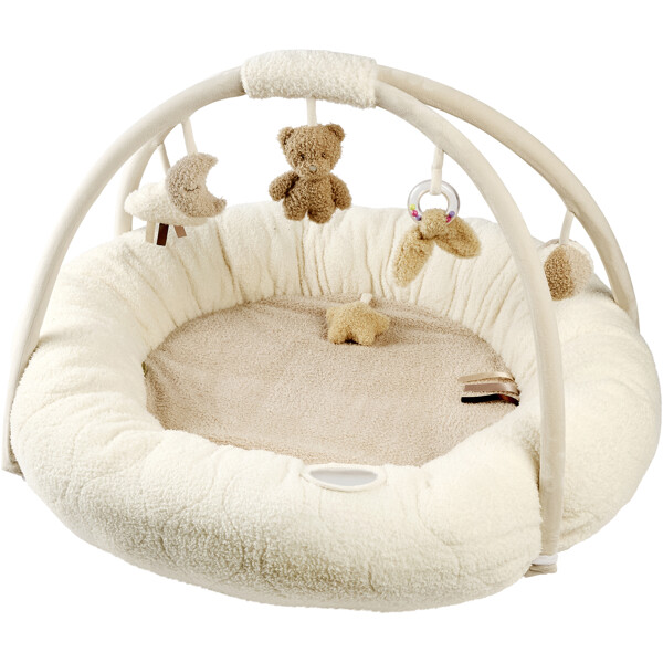 Nattou lekmatta med valv är en mjuk, plyschig lekplats där ditt barn känner sig tryggt och bekvämt. Den tjocka vadderade kanten och lekvalv med plyschleksaker, skallror, speglar och andra tillbehör inbjuder ditt barn att gripa tag i, utforska och leka. Gripreflexer och sensoriska färdigheter stimuleras genom lek, medan ditt barn också kan koppla av på den mjuka mattan. Valv är avtagbara, så mattan kan även användas på egen hand.ProduktspecifikationerBabylekmatta: 90 × 90 × 48 cm (L x B x H)Material: 100 % polyesterInkluderar vadderad kant, avtagbara valv med plyschleksaker, skallror, speglar och tillbehörSkötsel: mattan kan tvättas i maskin i 30 °C, valv avtagbara med spänne (torktumlas ej)