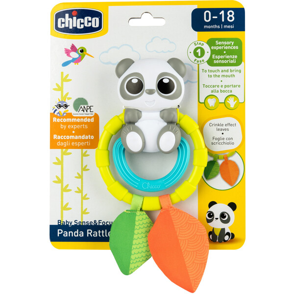 Panda-skallra med textil- och plast aktiviteter.Två ringar: den största roterar runt pandan och skapar en rolig rörelse, medan den minsta ringen är gjord av mjuk plast, perfekt under barnets tandsprickning.