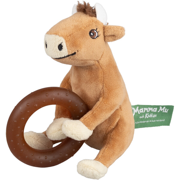 Mjuk Mamma Mu som snabbt blir en favorit hos de små. Den inbyggda ringen av naturgummi gör den enkel att hålla i för små händer - och perfekt att tugga på när tänderna är på väg.