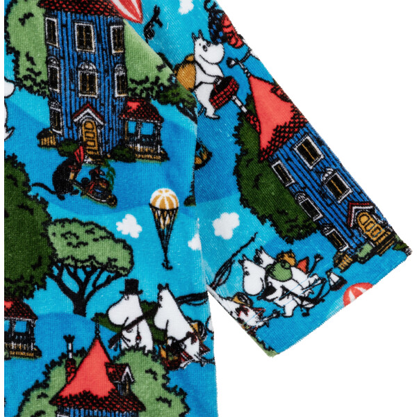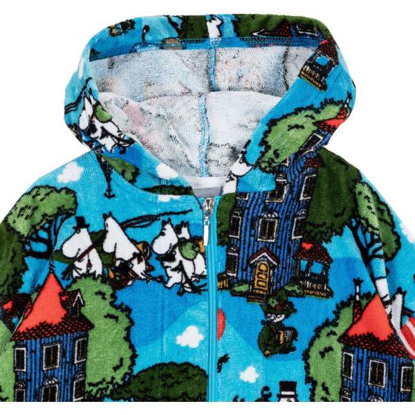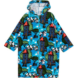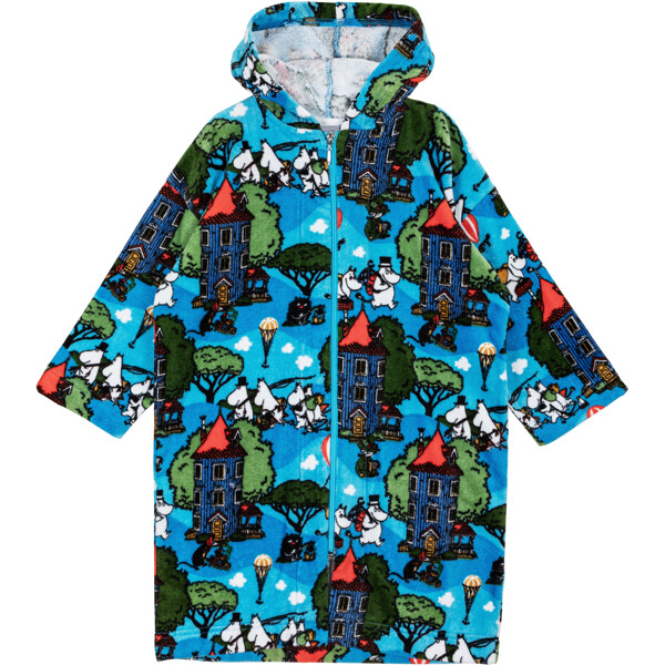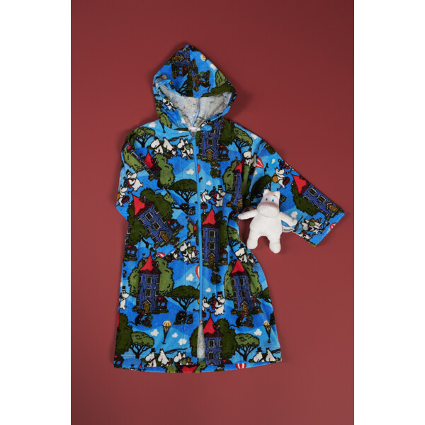 En mjuk och mysig Mumin badrock för barn. Badrocken har huva, upphängningsögla i nacken och blixtlås framtill. Materialet är mjuk bomullsvelour med insida av frotté med hög uppsugningsförmåga.