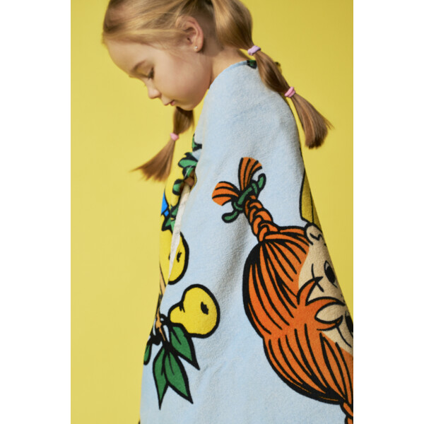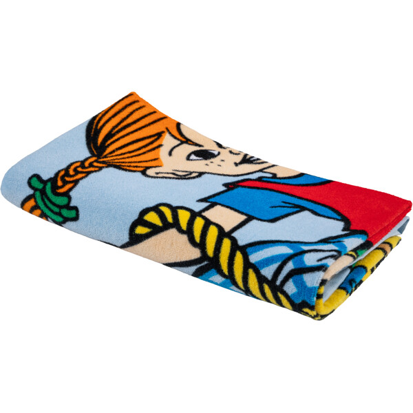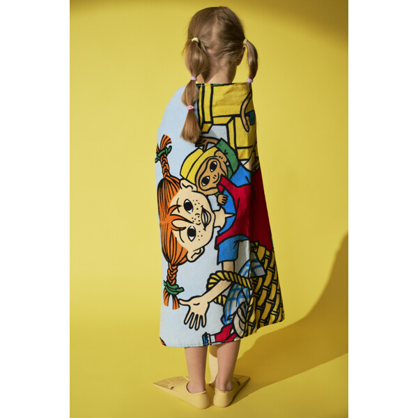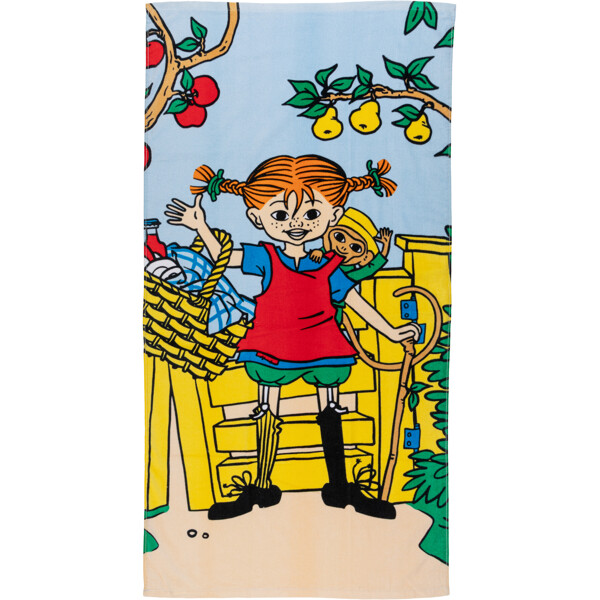 Pippi Långstrump Picknick Badhandduk är en färgglad badhandduk med Pippi och Herr Nilsson som ska ut på picknick. Badhandduken är mjuk bomullsvelour och en insida av frotté med hög uppsugningsförmåga.