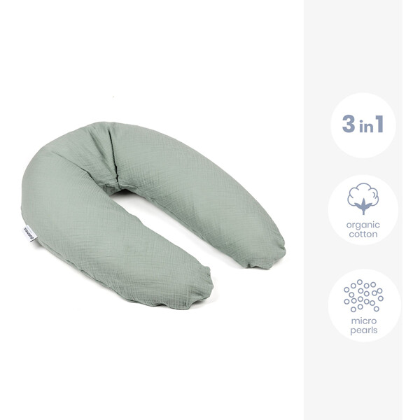 Doomoos kombinerade gravid- och amningskudde Muslin har fler smarta funktioner. Den kan även användas som ett skönt liggstöd till barnet, både när det ligger på mage och på rygg samt som ett säkert sittstöd, som en ”lära sitta-kudde”. Den fungerar även utmärkt som läskudde för både barn och vuxna.