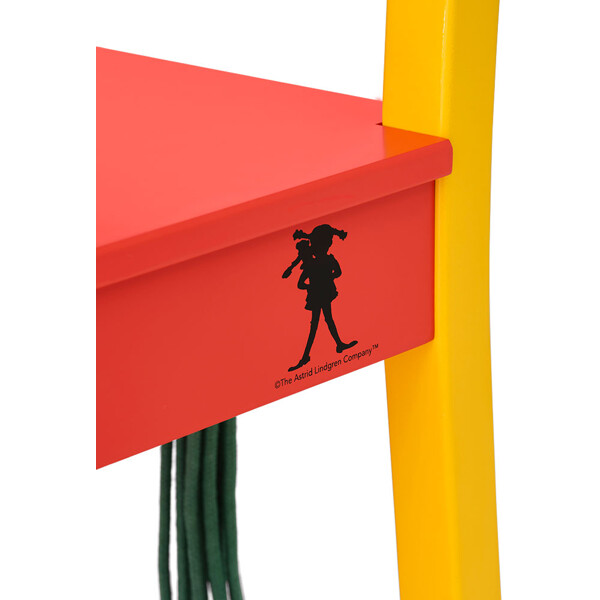 Bak på stolen finns en grön "hästsvans" av bomullssnöre . Och en av benen är målad i klargul färg, Oväntat och lite galet men det är väl så vi ser Pippi...? En praktisk möbel med mycket personlighet, perfekt för alla som, precis som Pippi, tycker att det är värt att prova nya saker.