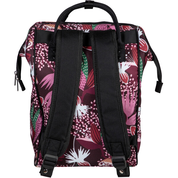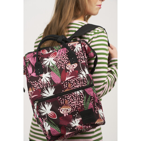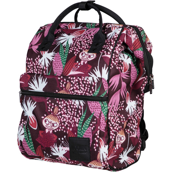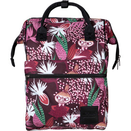 En rymlig Mumin ryggsäck i stadig polyestercanvas. Ryggsäcken öppnas stort upptill med dubbla blixtlås och inuti finns det en laptop-ficka mot den lätt stoppade ryggen. Blixtlåsförsedd ytterficka framtill och justerbara, vadderade axelremmar. Volym ca 15 liter.