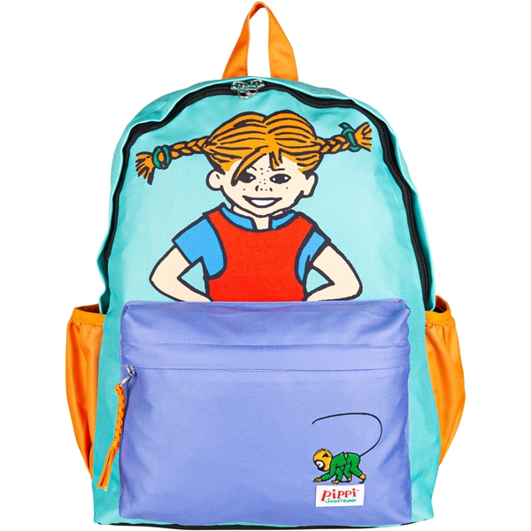 Stadig ryggsäck av slittålig polyestercanvas, helmönstrad med en stor tryckt Pippi Långstrump-bild och en broderad Herr Nilsson. Tvåvägsblixtlås, blixtlåsförsedd ytterficka, sidfickor för dricksflaska. Fodrad i svart, ficka med elastisk kant inuti mot ryggen och justerbara vadderade axelremmar, samt ett bärhandtag upptill. Volym cirka 15 liter.