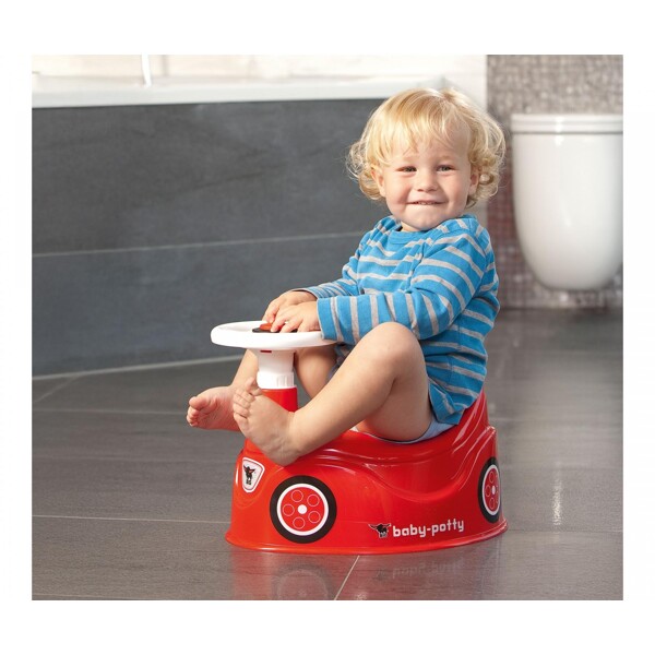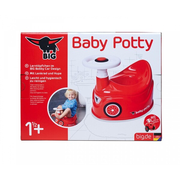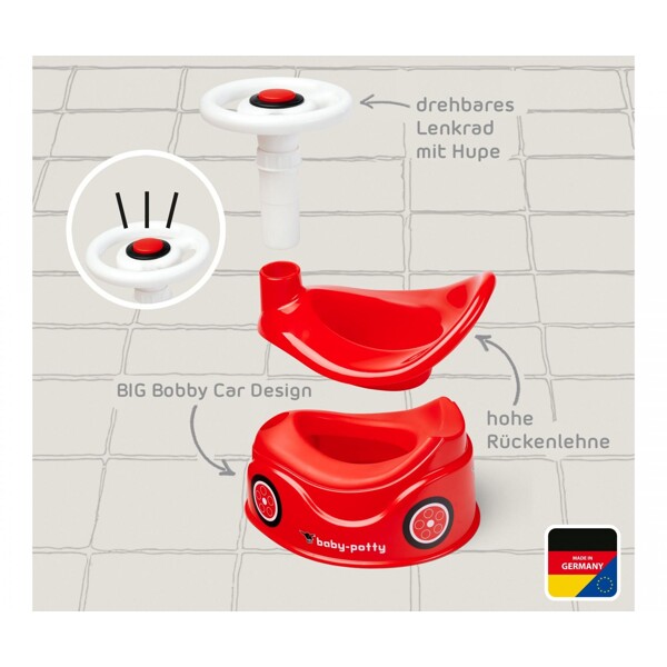 Från och med nu kan potträningen vara avslappnad och stressfri med BIG-Baby-Potty - eftersom den roliga pottan som är integrerad i BIG-Bobby-Car-designen gör potträningen rolig också. Med sin likhet med den populära BIG-Bobby-Car-Classic har den röda pottan med vridbar ratt en nästan magisk dragningskraft på små barn. Den barnvänliga sitsen med högt ryggstöd gör även de längsta träningspassen bekväma och avslappnade.