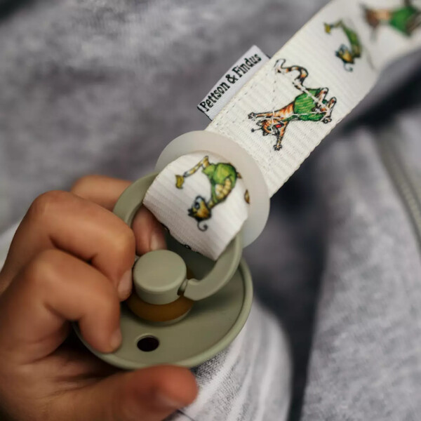 Napphållaren passar de flesta nappar på marknaden. Napphållaren är tillverkad av polyester med nickelfritt metallspänne och en elastisk ring av silikon.