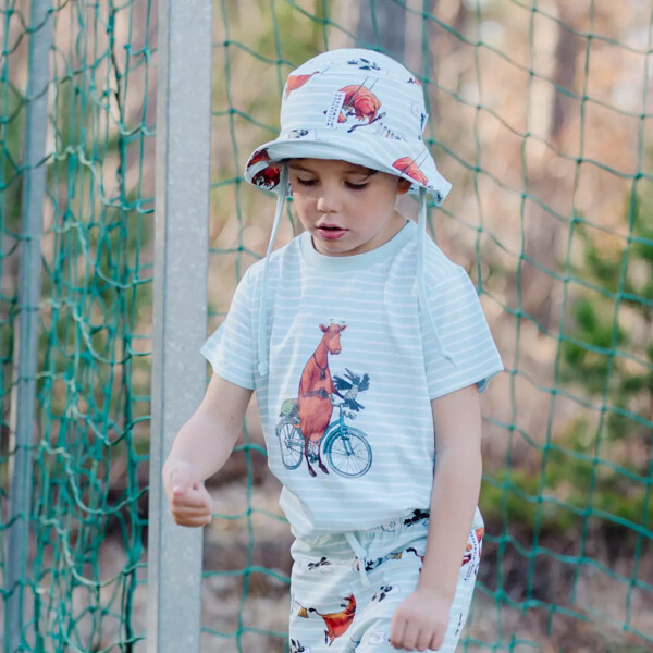 En solhatt i mjuk sval bomull i Mamma Mu print. Solhatten har snören för knyt under hakan och resår baktill för bästa passformen.