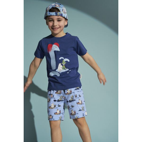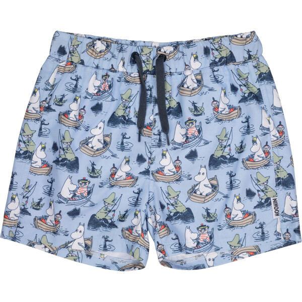 Fina Mumin badshorts för barn. Shortsen har dragsko i midjan, samt innershorts i mesh. Tillverkade i snabbtorkande återvunnen polyester.