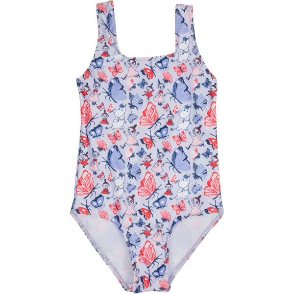 En skön Mumin baddräkt för barn. Baddräkten är fodrad framtill, hög i ryggen med breda och stadiga axelband. Tillverkad av elastisk, snabbtorkande polyesterblandning.