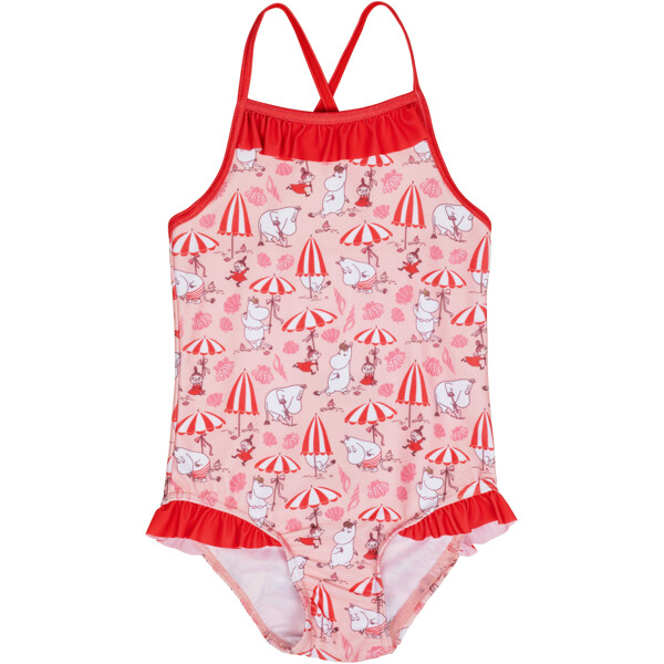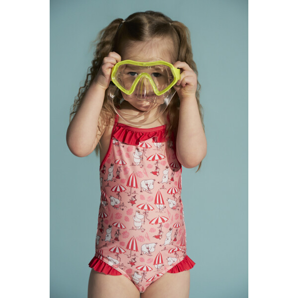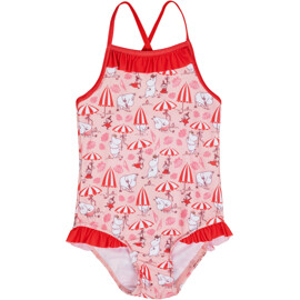 En söt Mumin baddräkt för barn. Baddräkten är fodrad framtill och den har korslagda axelband och små volangdetaljer i övre kanten och vid benen. Tillverkad av elastisk, snabbtorkande polyesterblandning.