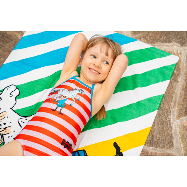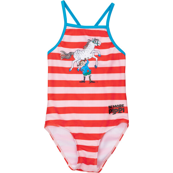 En rolig randig Pippi baddräkt för barn. Baddräkten är fodrad framtill, den är hög i ryggen och de tunna, korslagda axelbanden åker inte ned över axlarna. Tillverkad av elastisk, snabbtorkande polyesterblandning.