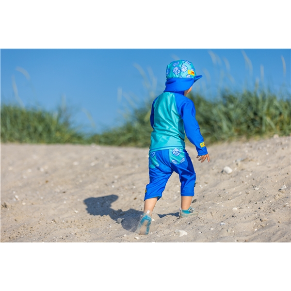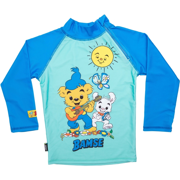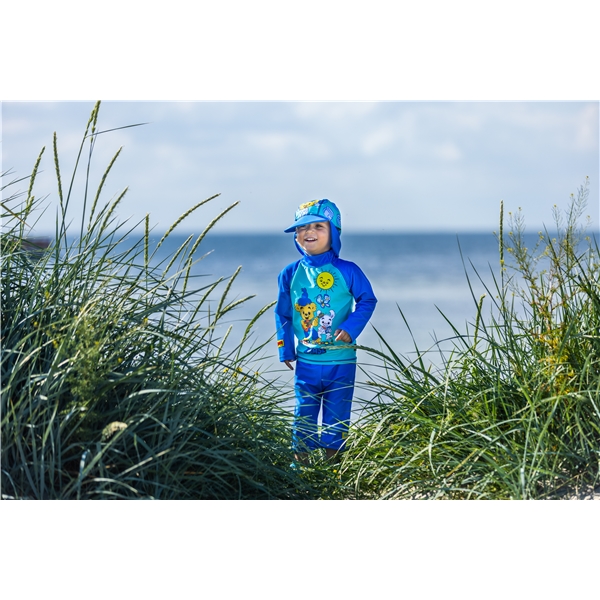 UV-Tröja från Swimpy med Bamse-motiv. Kläderna från Swimpy är elastiska, sköna och snabbtorkande, lämpliga i både sol och vatten. Plagget har ett certifierat UV-skydd motsvarande UP50+. Det är tygets täthet och struktur som ger skyddet och UV-skyddet håller så länge plagget är helt. Dragkedja i halslinningen gör det enklare att få på och av tröjan.