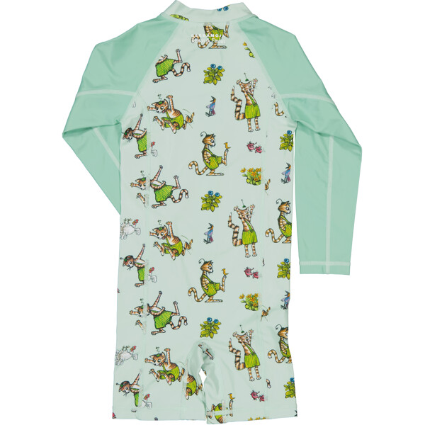 UV-dräkt med Pettson & Findus-print från Geggamoja. Långa ärmar och korta ben med dragkedja fram.