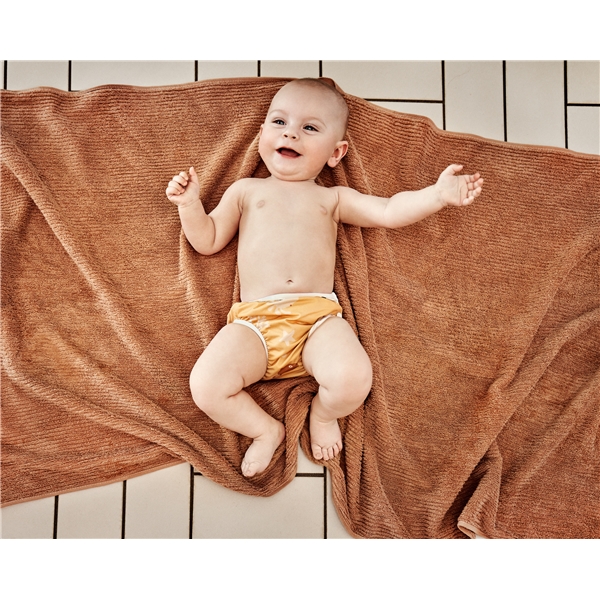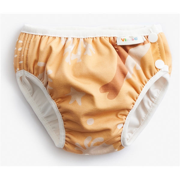 Badblöjan har mjuka resår runt midja och ben som gör att badbyxan sitter på plats och håller tätt. Tryckknapparna i sidan gör den enkel att på och av, även när den är blöt. Det behövs ingen extra blöja eller inlägg under badblöjan.