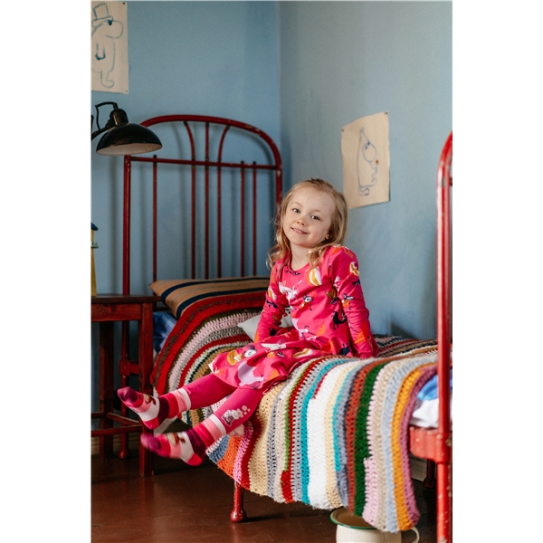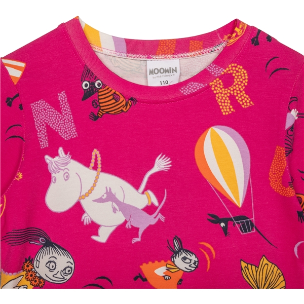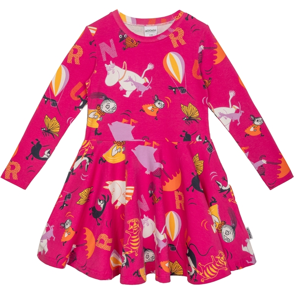 Långärmad klänning i fuchsiarött, helmönstrad med muminfigurer springande bland fjärilar och bokstäverna RUN. Den vackra kjoldelen är klockad och har ett underbart snurr! Ekologisk bomullsblandning.